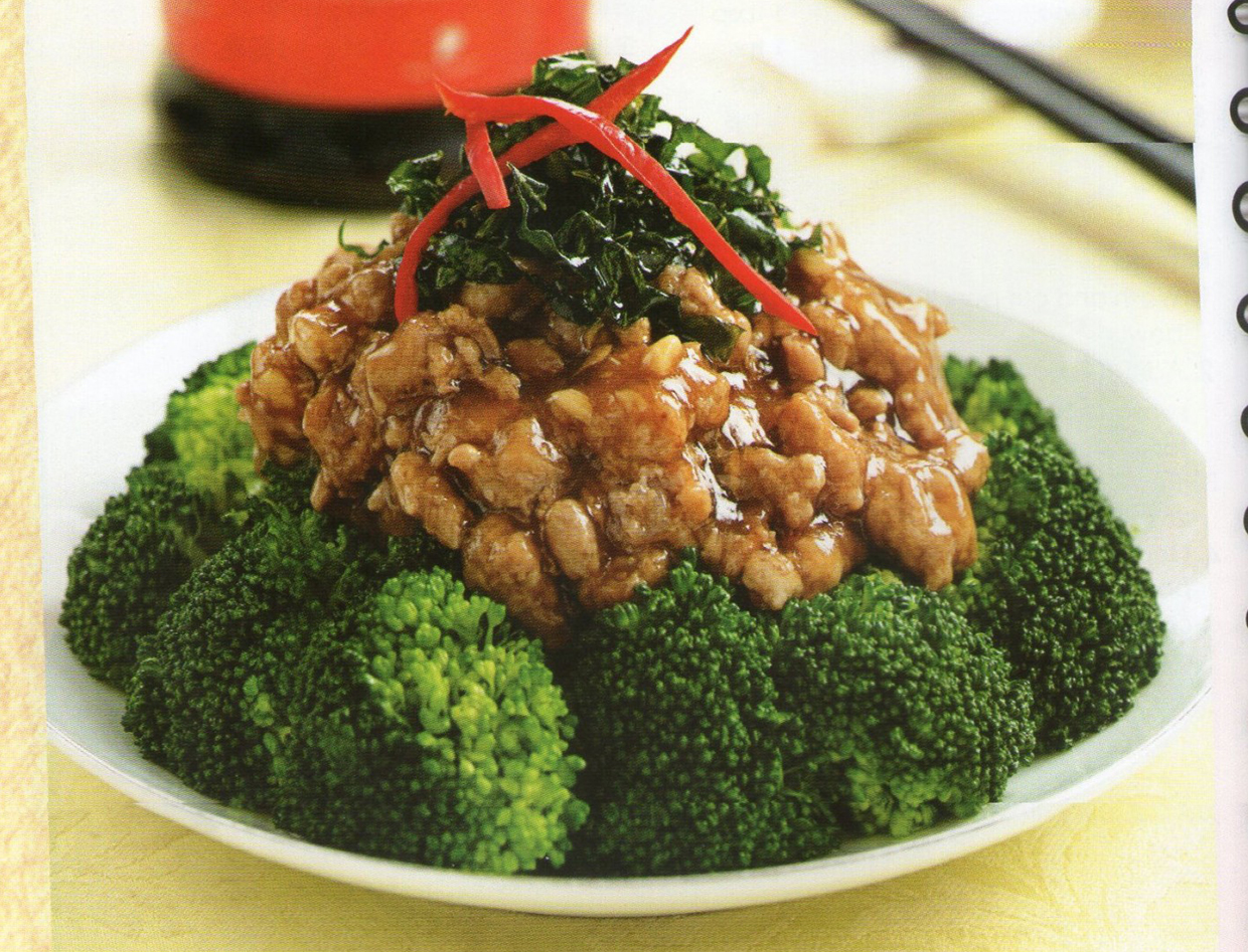 - Lastly, place minced meat on kai lan and add on shredded kai Ian.