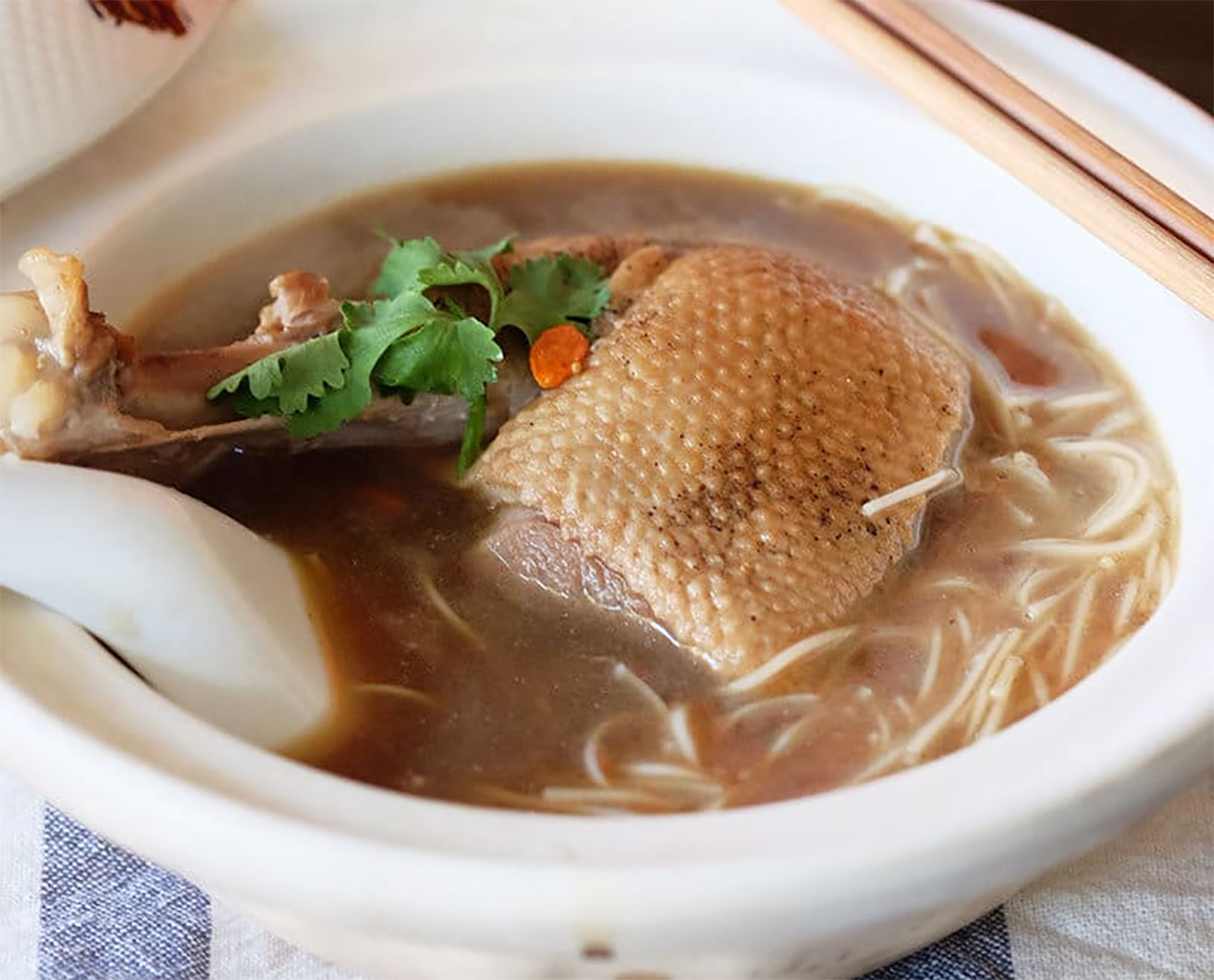8. Place vermicelli in serving bowls and ladle on the soup and duck meat.